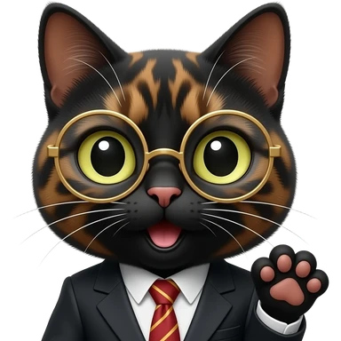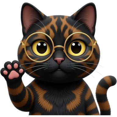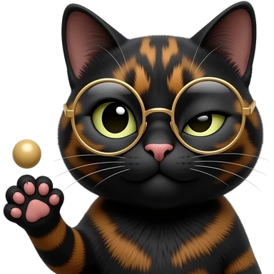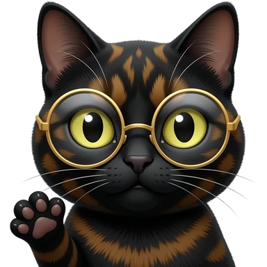 A mostly black Tortoiseshell cat face and paw, the Cat has a devious expression. Cat has round gold glassed and on paw up. emoji