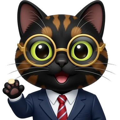 A mostly black Tortoiseshell cat face emoji looking like an eager professor, mouth speaking with round gold glassed and on paw up, with balm up . Only face and cat paw. emoji
