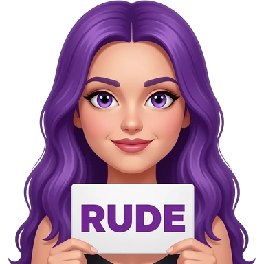 sexy girl with long purple hair and purple eyes holding a RUDE sign emoji