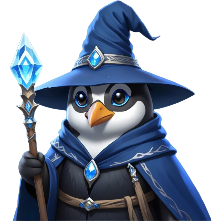A mysterious penguin mage with sleek midnight-blue feathers, wearing a flowing black robe adorned with silver runes. A tall, pointed wizard hat sits slightly tilted on his head, the brim casting a shadow over his glowing icy-blue eyes. His flipper clutches an ancient wooden staff topped with a swirling crystal, radiating a soft, cold light. Snowflakes drift around him as he stands on a frozen cliff, his aura crackling with arcane energy, ready to summon a blizzard with a flick of his staff.emoji