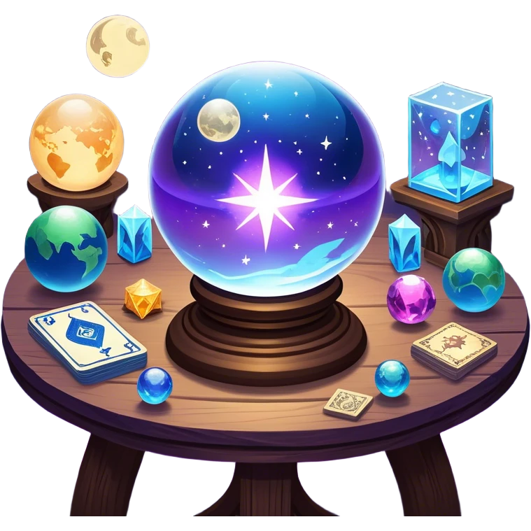 a mystical icon featuring a crystal ball (fortune-telling sphere) on a table with tarot cards scattered around. Surround the scene with planets, stars, and zodiac signs. The design is vibrant, magical, and evoke a sense of mystery and spirituality, with glowing effects and a cosmic atmosphere.emoji