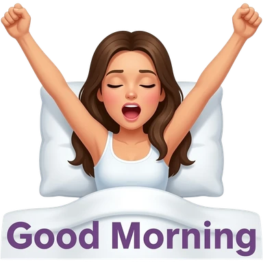 a naked tanned woman waking up in bed with arms fully stretched and the words "Good Morning" in blue printed overhead emoji