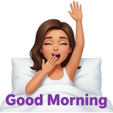 a naked woman waking up in bed with arms fully stretched and yawning with the words "Good Morning" in blue printed across emoji | AI Emoji Generator