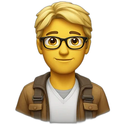 a nerd, with dirty blonde hair, blue and black glasses, with a devious smirk on his face emoji