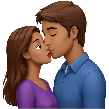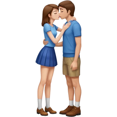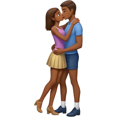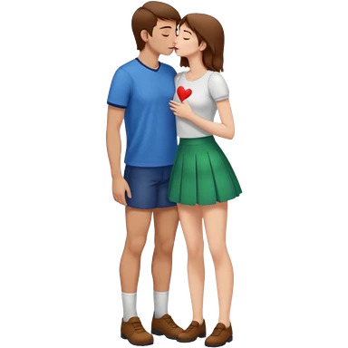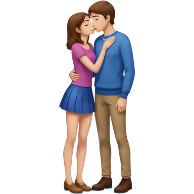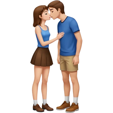 A naked girl with brown hair and bare small breasts openly kisses a tall guy with brown hair full-length on the lips. she is with naked boobs She is wearing a very short skirt and is in full height. emoji