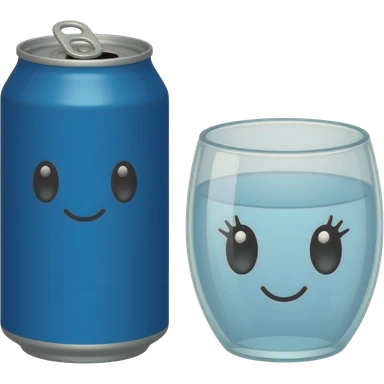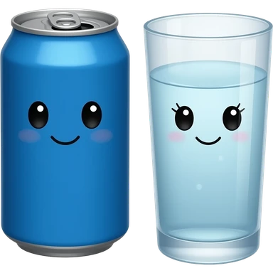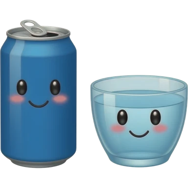 A plain blue soda can with a cute face without eyelashes and a glass bowl of water with a cute face with eyelashes emoji