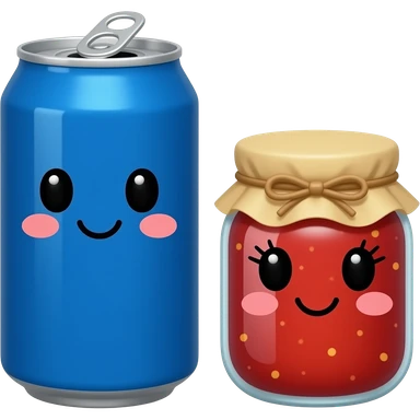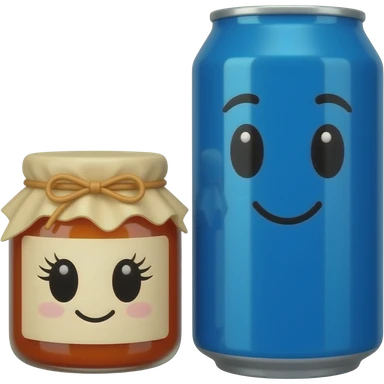 A plain blue soda can with a cute face without eyelashes and a jar of jam with a cute face with eyelashes, they both are the same size emoji