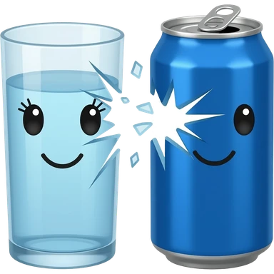 A plain blue soda can with a cute face without eyelashes and a tall glass bowl of water with a cute face with eyelashes shattering emoji