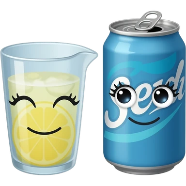 A plain blue soda can with a cute face and a pitcher of lemonade with a cute face with eyelashes emoji
