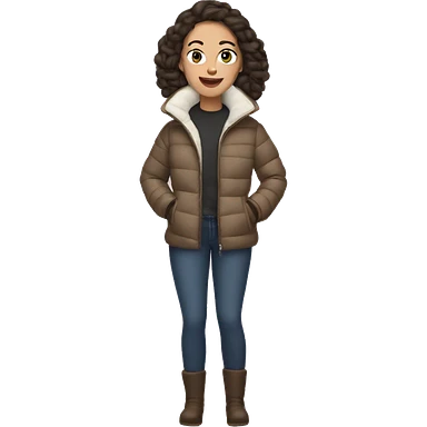 brunette girl with long hair with a light olive skin color and brownish eyes wearing fluffy white ear muffs and a white fur coat emoji