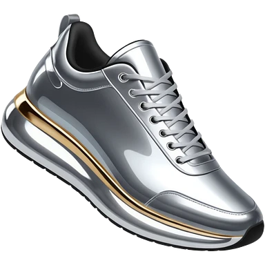 A pair of futuristic sneakers emoji made of silver chrome, sleek streetwear design, smooth metallic panels, subtle reflections, luxury swag aesthetic, iOS emoji style, centered, clean white background emoji