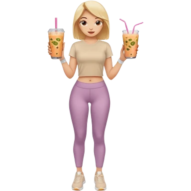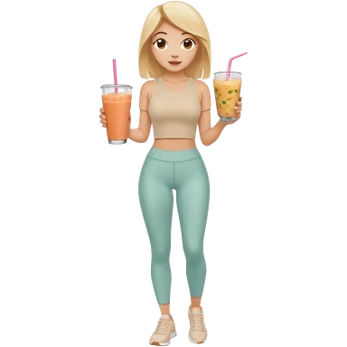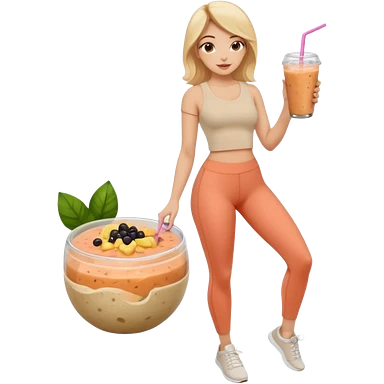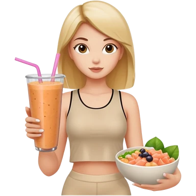 a young woman full length in a beige top and leggings and white sneakers with a passion fruit smoothie in one hand and a salmon poke bowl in the other hand emoji