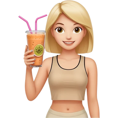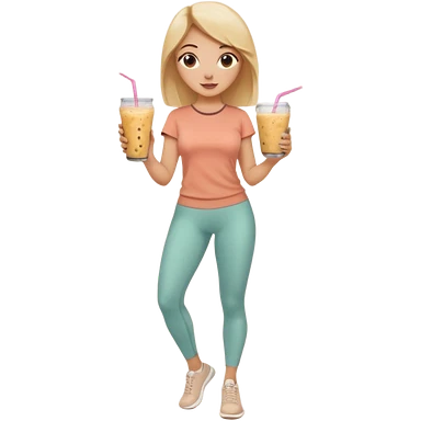 a girl with brown long straightened hair and blue eyes with pink leggings and pink sports top with a protein shake in her hand emoji