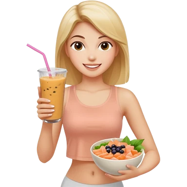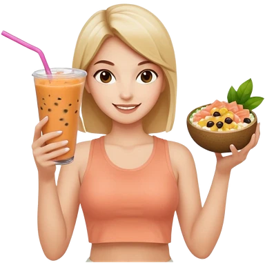 a young woman in a beige top and leggings and white sneakers with a passion fruit smoothie in one hand and a salmon poke bowl in the other hand emoji