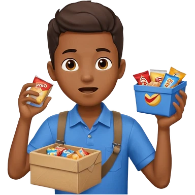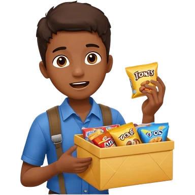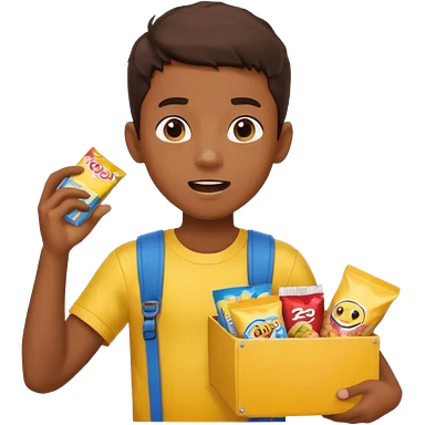 A young vendor boy with a snacks box strapped to his chest, calling out loudly. emoji