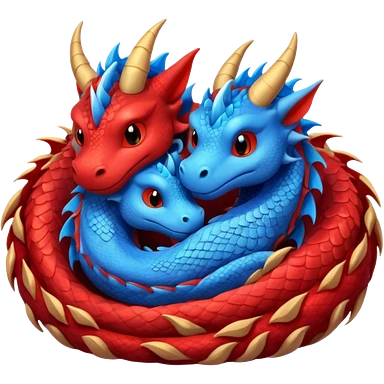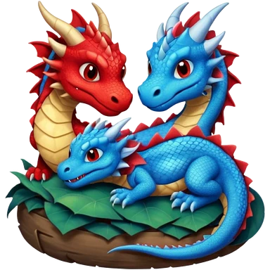 A pair of adorable red and blue dragons asleep in their den. emoji