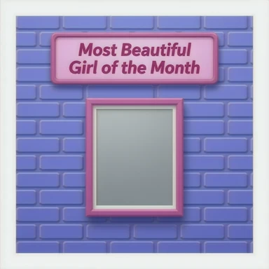 A clean aesthetic wall with a centered photo frame hanging on it, above the frame there is a sign that reads “Most Beautiful Girl of the Month”, soft lighting, minimal shadows, pastel tones, neat composition, empty frame for photo, 3D cartoon style, high quality inspired by Barbie colour palette emoji