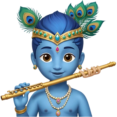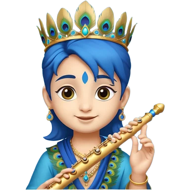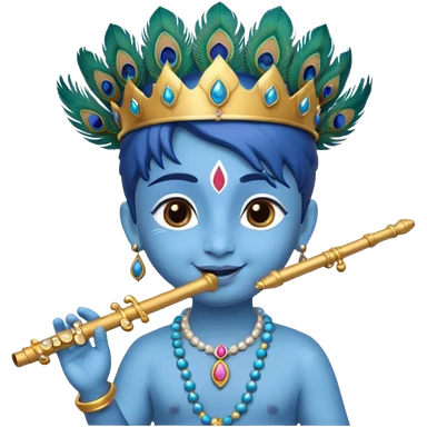 Cute young Krishna emoji, soft blue skin, peacock feather on crown, charming smile, holding a flute, big expressive eyes, round chibi emoji style, divine and joyful look." emoji