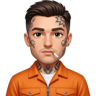 Multiple facial tattoos short dark brown hair wearing an orange jumpsuit smoking a cigarette and slight facial hair third person view emoji