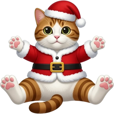 A white and brown cat with a Santa costume with his toes stretched out emoji