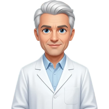 illustration of a male physicist, pale skin, rich white hair neatly combed, wearing a crisp white lab coat over a collared shirt, standing thoughtfully in front of a chalkboard covered with complex physics equations (E=mc 2 , quantum mechanics emoji