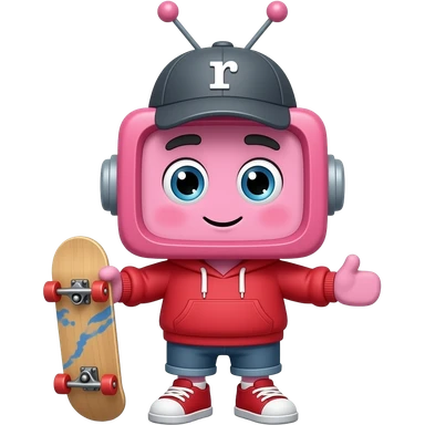 A pink tv with a hat that has an r on it with antennas coming out where it is holding a skateboard with a square body arms and legs wearing a red hoodie emoji