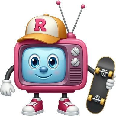 A pink tv with a hat that has an r on it with antennas coming out where it is holding a skateboard emoji