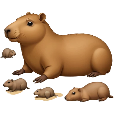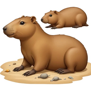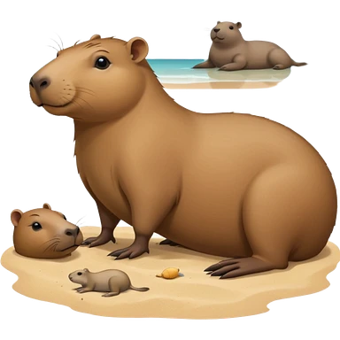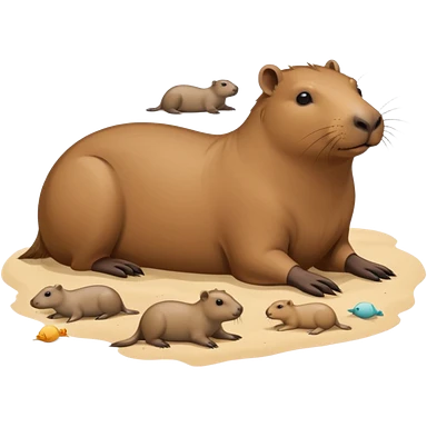 a capybara with a seal laying on a peaceful beach with other capybaras close by emoji