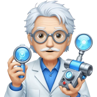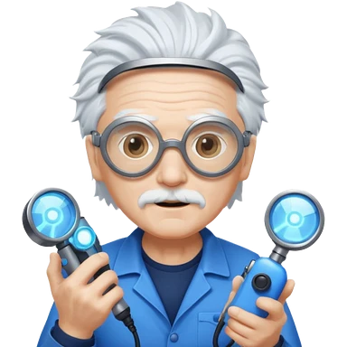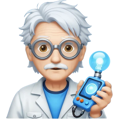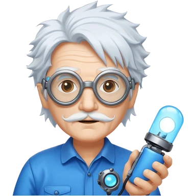 A quirky old inventor with wild white hair, goggles, and a glowing gadget in hand. emoji