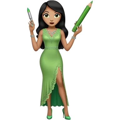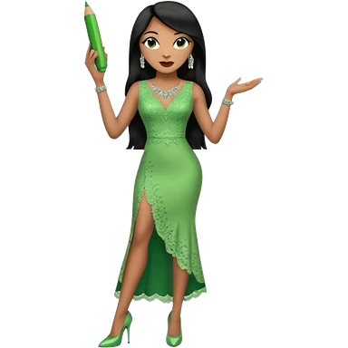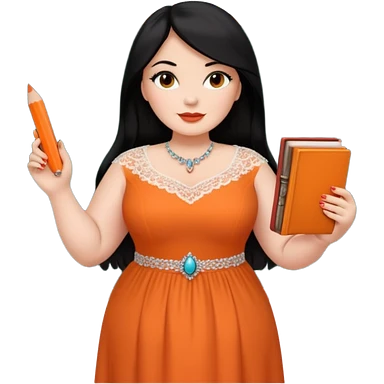 A plus-size brunette woman with short, dark brown curly hair is wearing a red sleeveless shirt and a black lace ruffled skirt. She is sitting on the floor with her legs crossed, holding a crayon in one hand. On the floor are five stacked colorful books and a glass vase with red roses. emoji | AI Emoji Generator