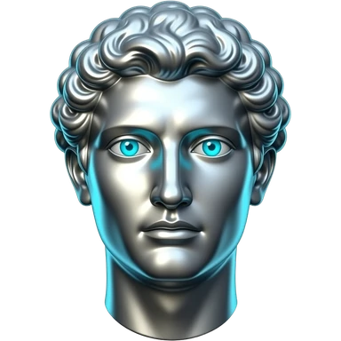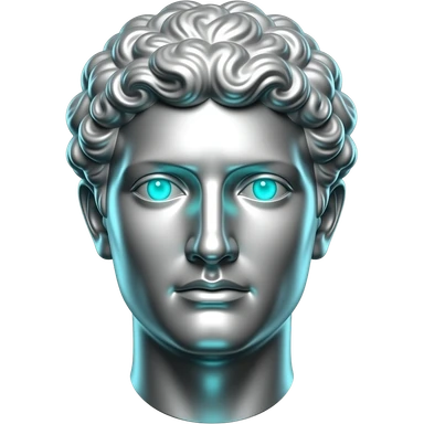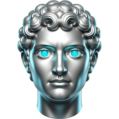 "Silver Greek statue bust, front view, stoic expression, eyes glowing bright cyan (#00D4B1), cyan light reflecting off the metallic surface. Dark background, emoji style, transparent background, high detail." emoji