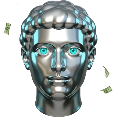 A polished chrome stoic Greek statue head glowing cyan (#00D4B1) eyes, dark background. Metallic reflections with subtle cyan light accents. with money coins falling in the background emoji | AI Emoji Generator