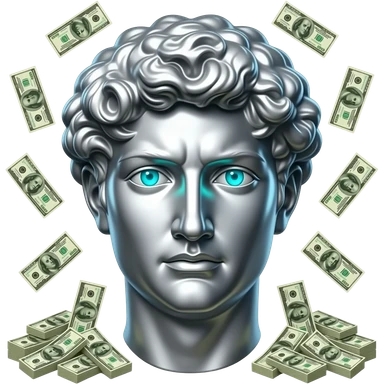 A polished chrome stoic Greek statue head front facing with glowing cyan (#00D4B1) eyes, no background. Metallic reflections with subtle cyan light accents. with cash falling in the background emoji