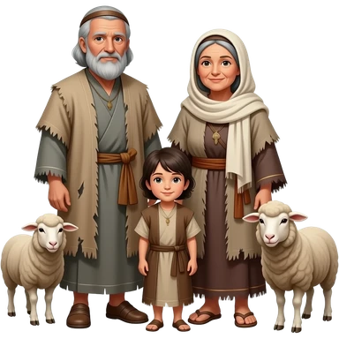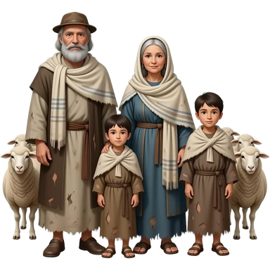 A Jewish nomadic family with an old man old woman and 2 children, wearing old tattered draped clothing from biblical times with sheep emoji