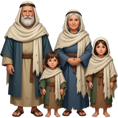A poor nomadic family with an old man old woman and 2 children, wearing old tattered draped clothing from biblical times emoji | AI Emoji Generator