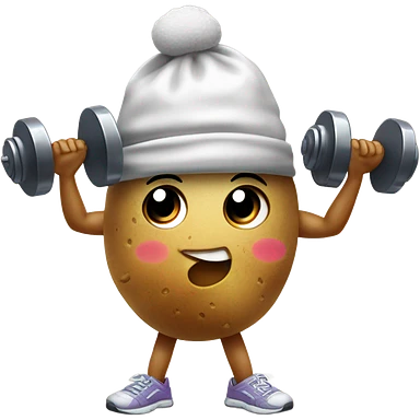 Picture a little potato character with arms, wearing tiny workout gear like a headband and sneakers. It’s lifting a dumbbell in one hand and dripping sweat with tiny droplets around it, maybe even with a determined facial expression. emoji