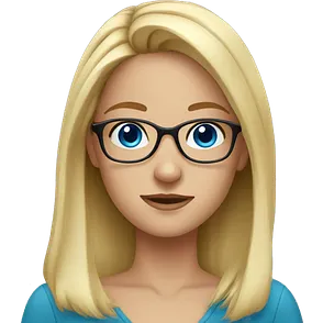 A pretty blonde girl with long and wavy at the bottom with blue eyes and glasses emoji | AI Emoji Generator