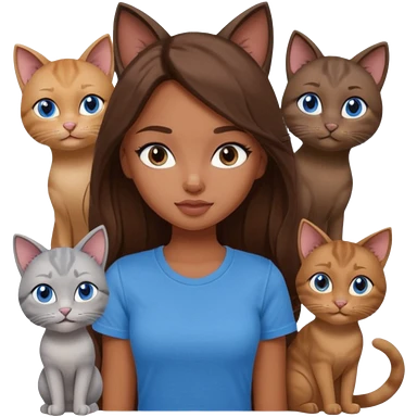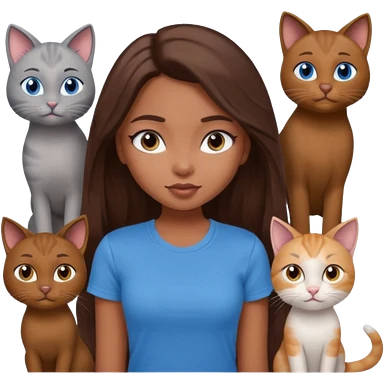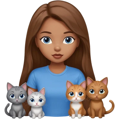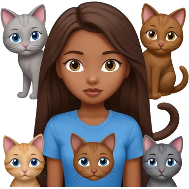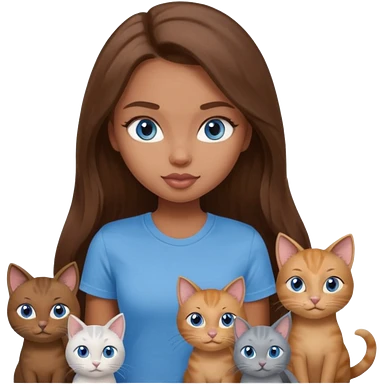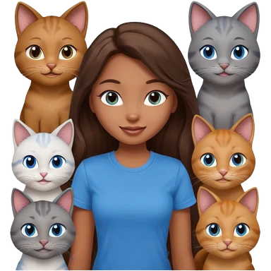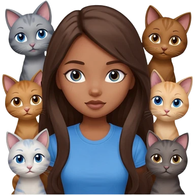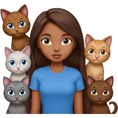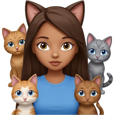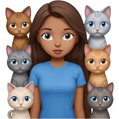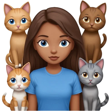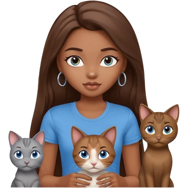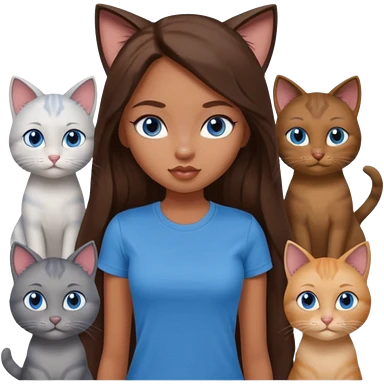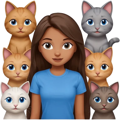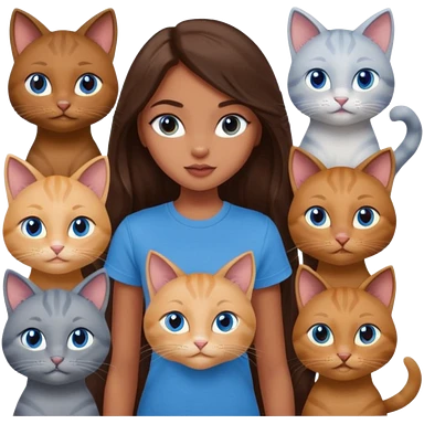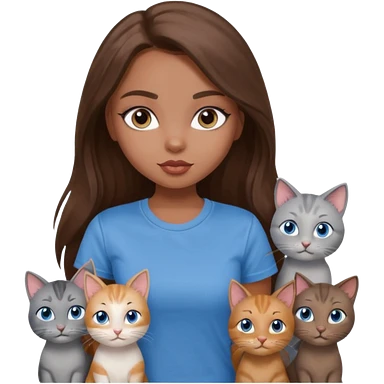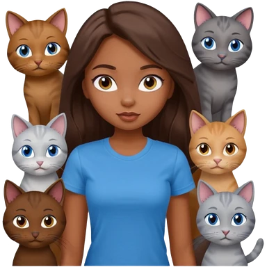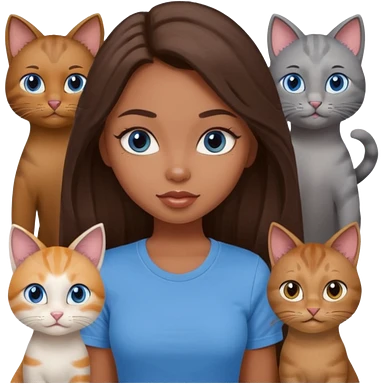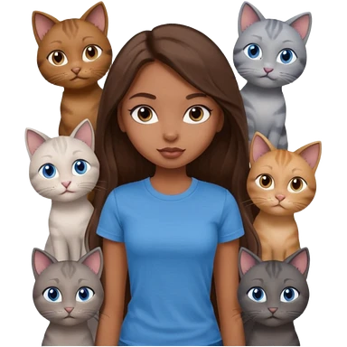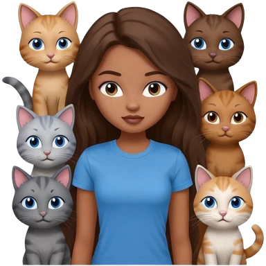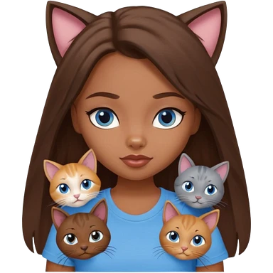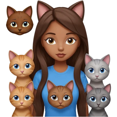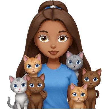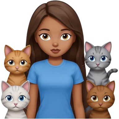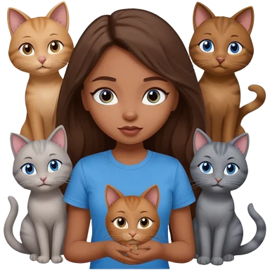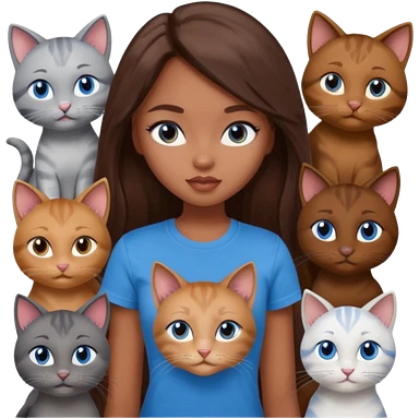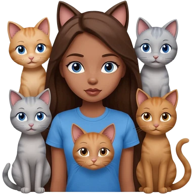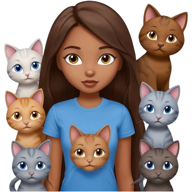 a pretty bratz dusky girl with long brown hair, blue eyes with six cats nd wearing a grey tshirt emoji | AI Emoji Generator