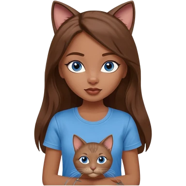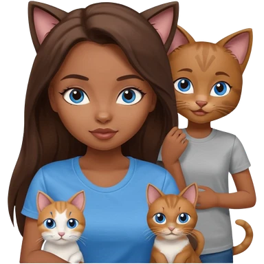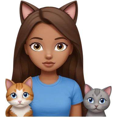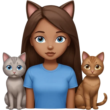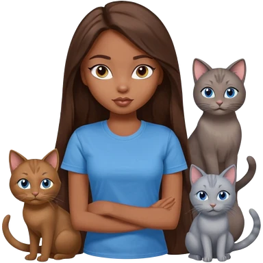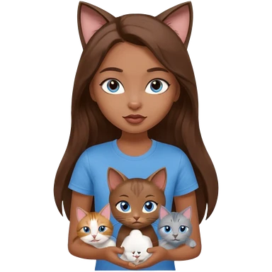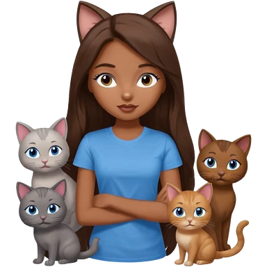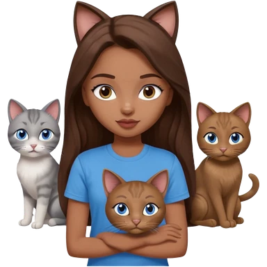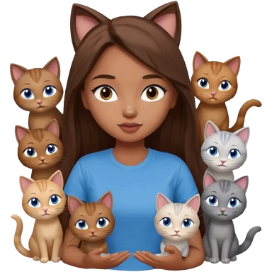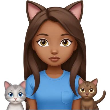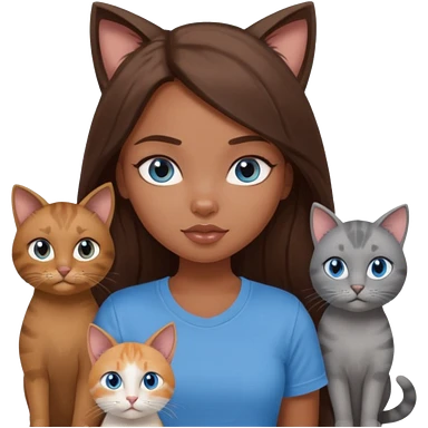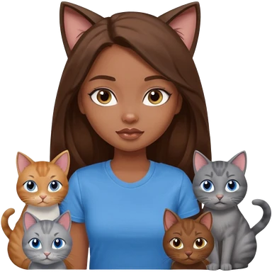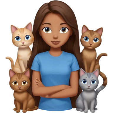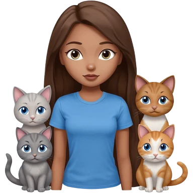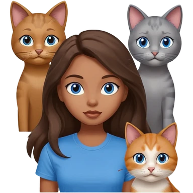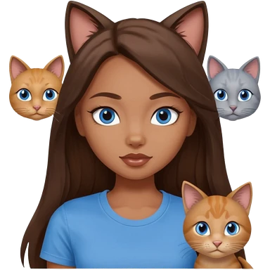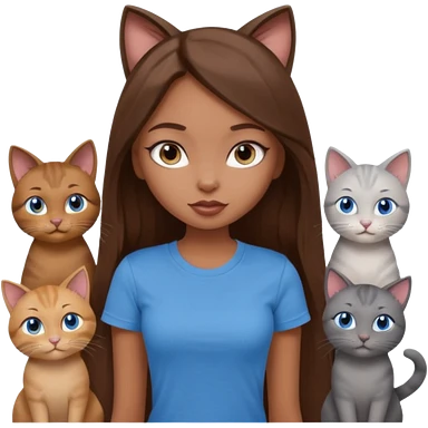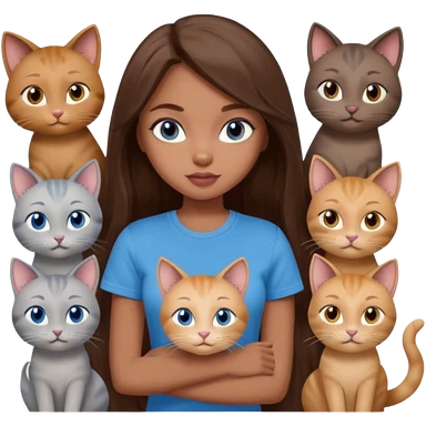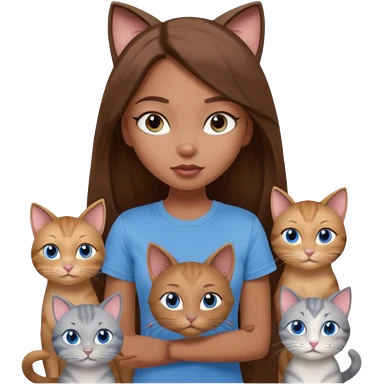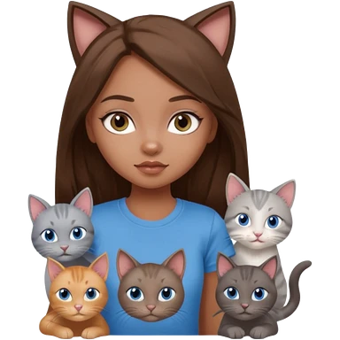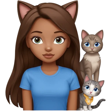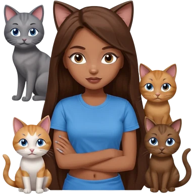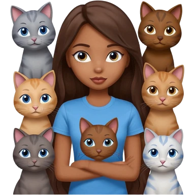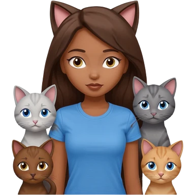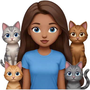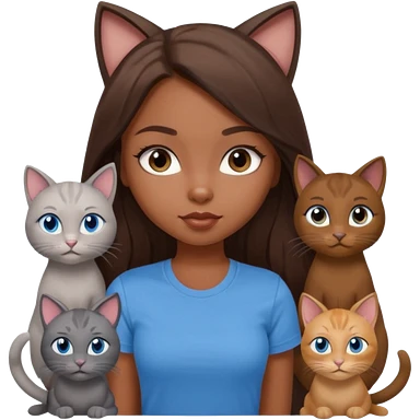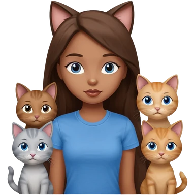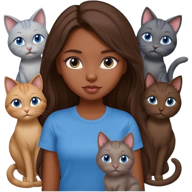 a pretty bratz dusky girl with long brown hair, blue eyes with six cats nd wearing a grey tshirt emoji | AI Emoji Generator