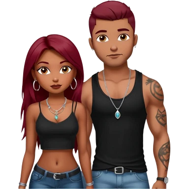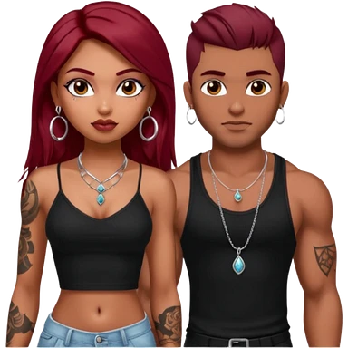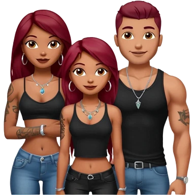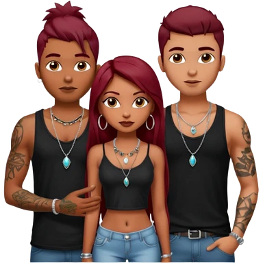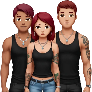 a pretty bratz fair girl with dark red straight hair, black cami top, silver dainty necklaces, rings, hoops, tattoos standing with two handsome lean but muscled guys emoji | AI Emoji Generator