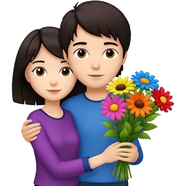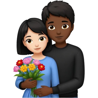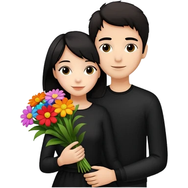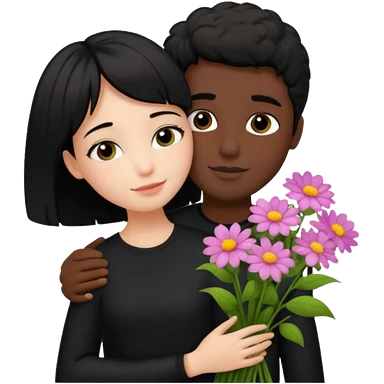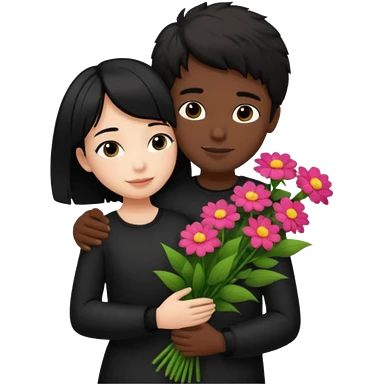 a pretty bratz fair girl with short black shaggy hair with a tall boy hugging her and flowers wearing black emoji