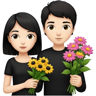 a pretty bratz fair girl with short black shaggy hair with a tall boy and flowers wearing black emoji
