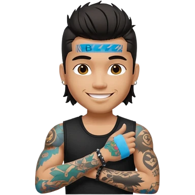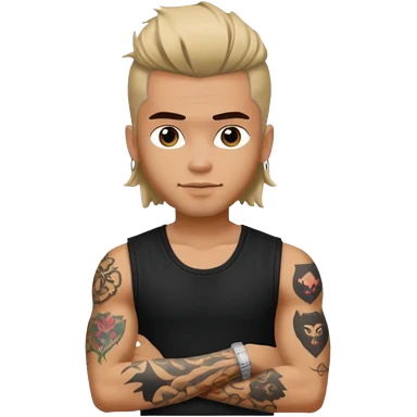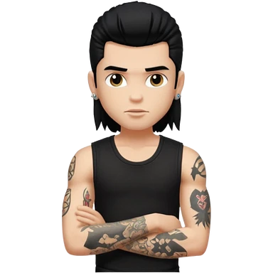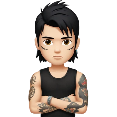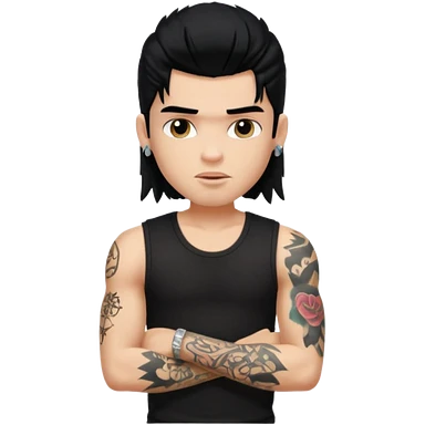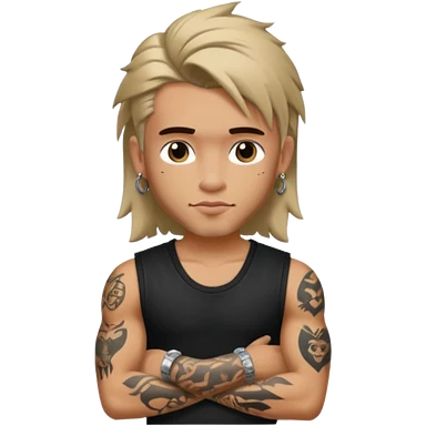 a pretty bratz guy with a black mullet and a sleeveless black top with tattoos on arm emoji | AI Emoji Generator