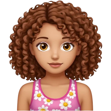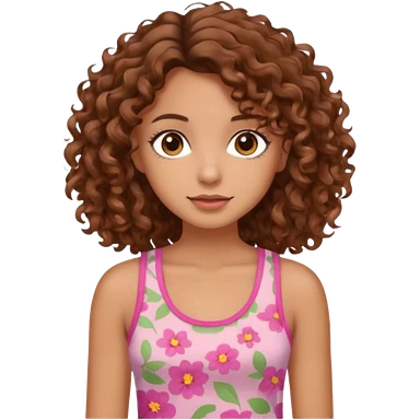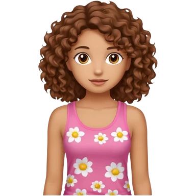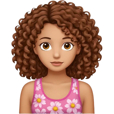 A pretty girl with tan skin and brown wavy curly hair, wearing a floral pink tank top with brown eyes emoji