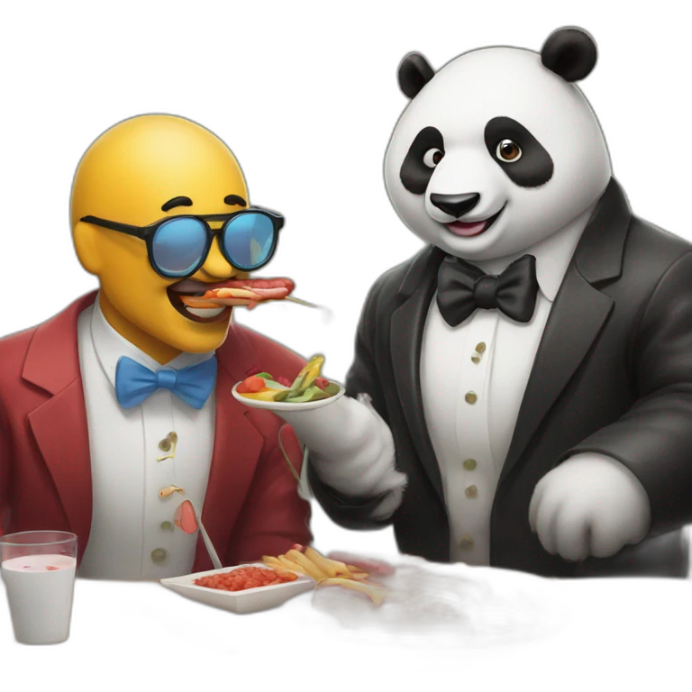 A professor and a panda in clown makeup are sitting and eating hotdogs with shrimp emoji | AI Emoji Generator