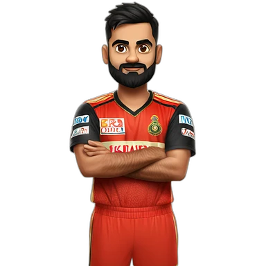 create a virat kohli standing while folding his hands wearing RCB Jeresy emoji