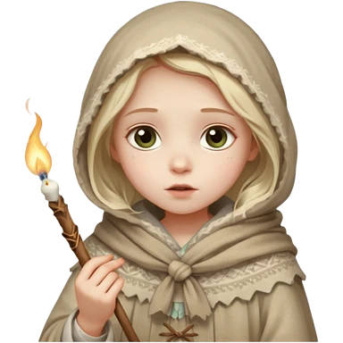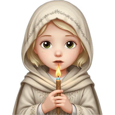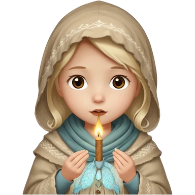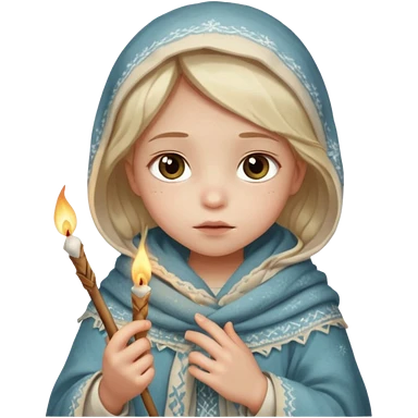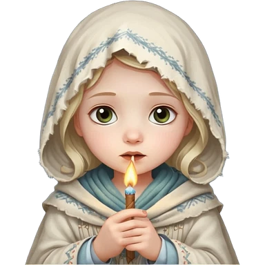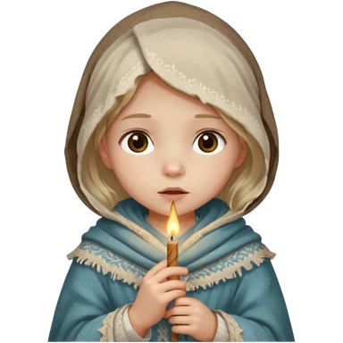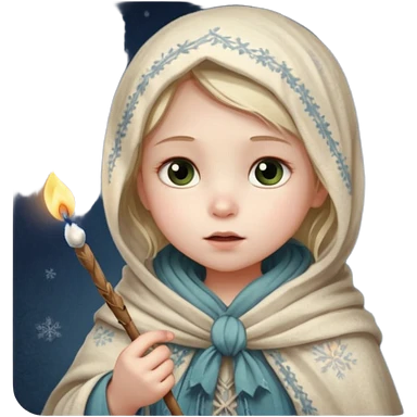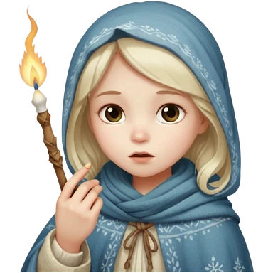 A small girl in a worn winter dress and shawl, holding a glowing matchstick close to her face, eyes wide with soft hope. emoji