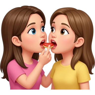 A girl kissing another girl on the cheek, both are blushing. They both have white skin and long black hair emoji