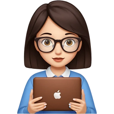 A chocolate-haired girl with square glasses, holding a Mac computer in her hands emoji