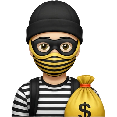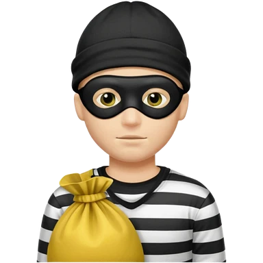 A Robber Emoji, the robber is Male, has a Black Beanie hat, has a shirt with black and white stripes, a black mask thing around his eyes, and a yellowish money bag on his hanging right shoulder, we can only see his upper body from his chest and his face he has NO face mask and looks like 🧑🌾 emojiemoji